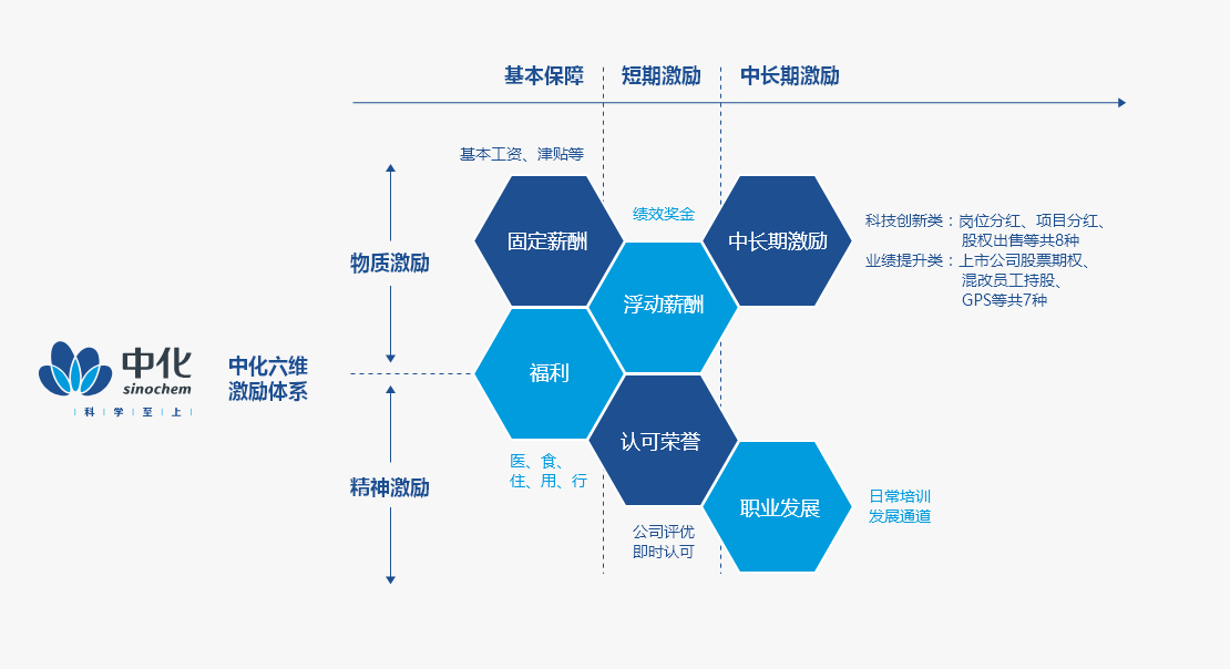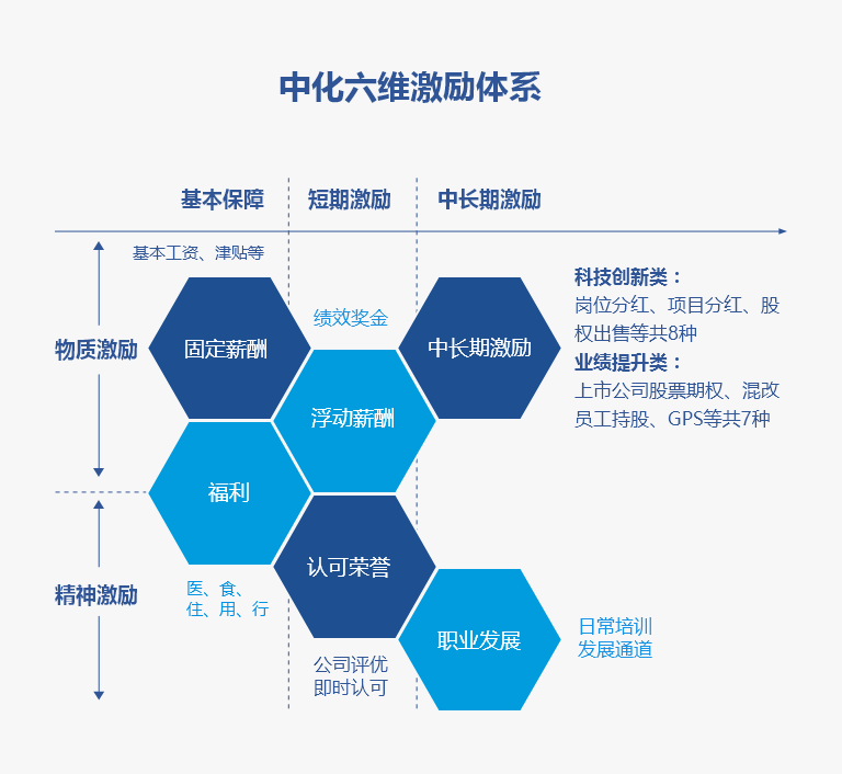 中國中化秉承“在堅持國有企業(yè)屬性前提下、無限接近市場化”的激勵理念,秉承“為崗位付薪、為能力付薪、為績效付薪”相結合的3P付薪原則,不斷完善自身多元化激勵機制,搭建短中長期相結合、物質與非物質相結合的“六維激勵體系”。