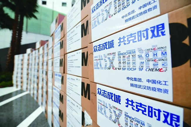 1月29日,中化集團與中國化工宣布向湖北疫情防控一線捐款共計5000萬元;兩化聯合向武漢華中科技大學同濟醫學院捐贈六萬只口罩;各級黨組織號召和組織廣大職工自愿進行捐款;