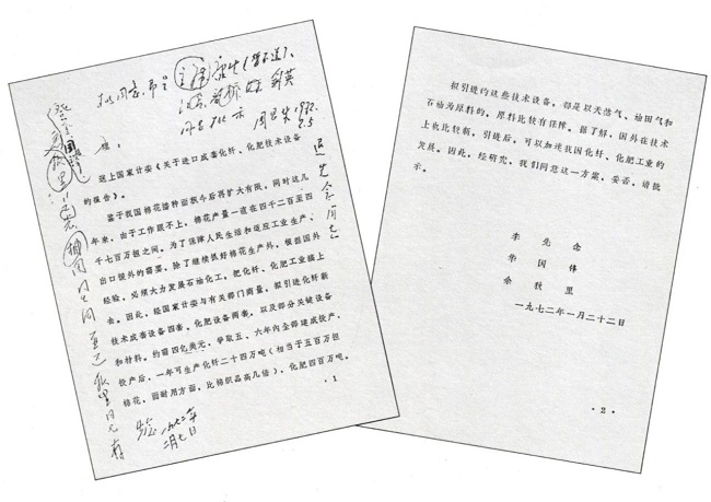 1971年8、9月間毛澤東到南方視察時,一位幫他做社會調查的工作人員在一家服裝店千辛萬苦排了半天隊買到的了一條“的確良”褲子,“的確良”挺括,不會皺,這種當時風靡全國的面料,原材料都需要進口,非常緊俏。回到北京后,毛澤東和周恩來商量,咱們也要自己造!一個關系億萬群眾穿衣吃飯問題的大規模技術設備引進工程拉開序幕,1972年2月5日,毛澤東、周恩來批準了國家計委《關于進口成套化纖、化肥技術設備的報告》。