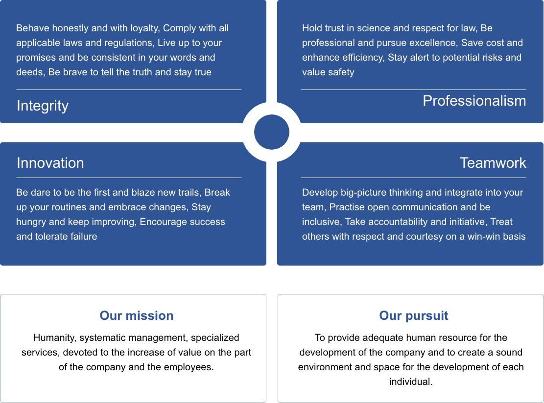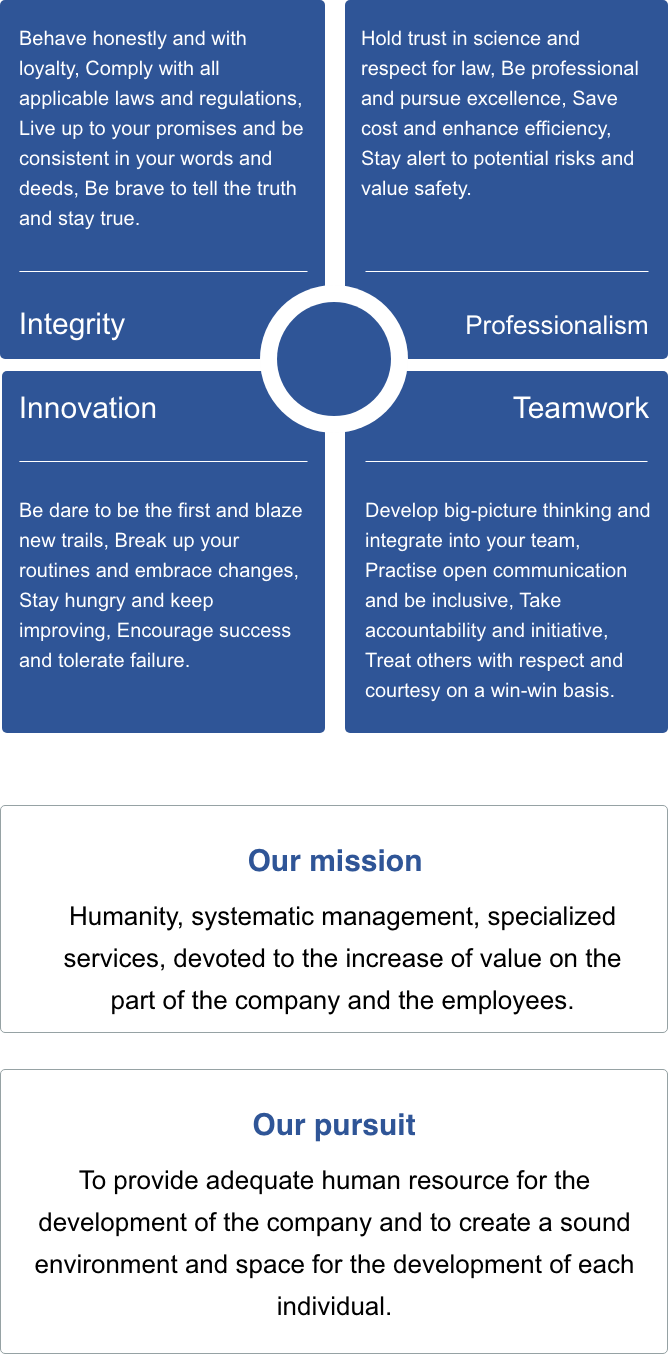 The vitality of Sinochem Holdings derives from the originality of all employees and it is the joint efforts of all employees that lead to the prosperity of the company; the very vitality consists in the creativity and innovation of all employees. It is the power of employees that pushes forward the development of the company; conversely, the development of each individual employee needs opportunity and space from the company. Therefore, it is our pursuit to effect the common prosperity of the employees and the company.